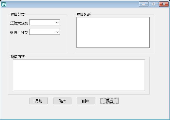 功能说明:该程序是一个用于管理短信预设内容的工具,主要功能包括读取运行目录下的文件夹并显示在组合框中,选择文件夹后读取其中的文件到另一个组合框,再根据配置文件顺序将标题加载到列表框。用户可以通过双击列表框中的标题查看对应内容,同时提供了添加、修改和删除预设内容的功能,并有退出按钮。程序的核心功能围绕短信预设内容的管理与操作展开,标题为“短信预设管理器”。