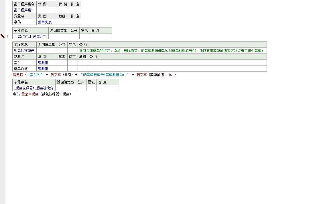 此外,程序还具备界面自定义功能。通过“颜色选择器 1_颜色被改变”子程序,用户可以实时调整菜单的颜色风格。一旦颜色选择器的值发生变化,程序会立即调用“置菜单颜色”方法更新菜单显示效果,提供了良好的视觉交互体验。