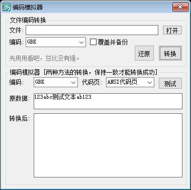 功能说明:该程序是一个面向中文Windows环境的文件编码转换与编码行为验证工具,主要功能包括:1)对指定文本文件进行编码格式批量转换(如GBK、UTF-8、UTF-16LE等),支持转换前自动备份(生成.bak文件)或另存为新文件(.new);2)提供交互式编码转换测试模块,可将用户输入的文本实时转换为字节集,并依次执行多步编码操作:先按指定源编码(如GBK)转为目标编码(组合框2选择),再通过A2W(ANSI to Wide)函数转为UTF-16LE宽字符,最后通过W2A(Wide to ANSI)或反向编码转换还原为多字节文本,全程在超级编辑框中逐层显示原始数据、各阶段字节集长度及具体内容、转换路径和结果,便于开发者直观验证编码转换逻辑与字节映射关系;3)提供文件路径选择、备份还原(按钮3可一键将.bak文件恢复覆盖原文件)、界面初始化(下拉框默认选中首项)等辅助功能。程序依赖iext2与iconv支持库,核心逻辑围绕“文件编码转换类”的打开与转换方法、底层字节集操作(编码转换、到宽/多字节数据)、以及可视化反馈展开,适用于程序员调试乱码问题、测试不同编码兼容性、教学演示字符编码原理等场景。