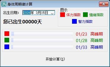 功能说明:该程序是一个基于易语言开发的生物节律(Biorhythm)计算工具,主要用于根据用户输入的出生日期,自动计算并可视化展示其当前的体力、情绪和智力三种基本生物节律状态。程序核心功能由“_超级按钮1_被单击”子程序触发:首先通过“取时间间隔”函数计算从出生日(由日期框1.今天获取)到当前系统日期(取现行时间)之间的总天数(单位为天),作为生物节律计算的基础周期值;随后分别对总天数按23天(体力周期)、28天(情绪周期)和33天(智力周期)取模,得到各节律在当前周期内的相位位置(0~22、0~27、0~32);再将这三个余数值映射至三个多功能条控件(进度条)进行直观显示,并在对应标签中显示具体数值与周期比值(如“15/23”);最后依据各节律相位值与临界点(体力临界点为11,情绪为14,智力为17)的大小关系,判断并标注当前处于“高峰期”(小于临界值)、“临界期”(等于临界值)或“低谷期”(大于临界值)——需注意此处逻辑虽表述为“<临界值→高峰期”,但符合经典生物节律理论中“相位值越小越接近周期起始,而高峰期通常出现在周期中段偏前”的简化模型设定(实际理论中高峰期对应sin值接近+1,即相位≈?周期,此处以临界点分割为三段式经验判断)。界面元素包括日期输入框、三个进度条(分别代表体力/情绪/智力)、六组数值与状态标签,整体设计简洁,面向普通用户实现一键测算与状态解读,无数据存储、联网或高级分析功能,属于典型的单机轻量级健康辅助计算工具。