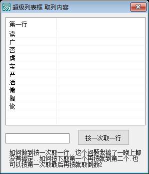1. **初始化超级列表框**:当启动窗口创建完毕时,程序会自动创建一个超级列表框,并向其中插入一定数量的列和表项。每列标题由数字转换成中文表示(如“第一行”、“第二行”等),每个表项的内容为随机生成的一个汉字。
