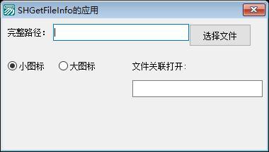 程序界面包含一个路径编辑框用于显示文件路径、一个图片框用于显示文件图标、一个显示打开方式的编辑框,以及大图标和小图标的单选框选项。用户点击"选择文件"按钮后可以打开文件对话框选择目标文件,程序会根据用户选择的大图标或小图标模式来获取并显示文件的关联图标。