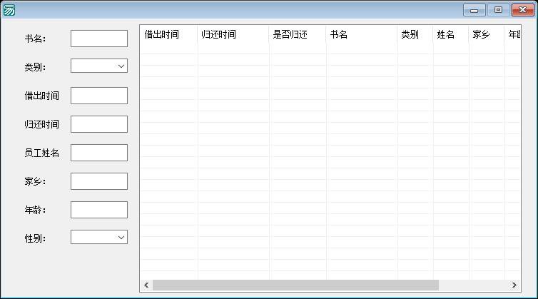 功能说明:该程序是一个用于显示图书借阅记录的易语言程序。其主要功能是从一个名为“图书管理.mdb”的数据库中查询并展示借阅信息,包括借出时间、书名、类别、员工姓名、家乡、年龄和性别等数据。程序通过连接数据库,执行SQL查询获取相关记录,并将这些记录以超级列表框的形式展示在窗口中。程序的核心功能围绕“借出记录”展开,因此可以判断这是一个与图书借阅管理相关的程序,主要用于查看和展示图书借阅的历史数据。